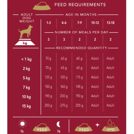Au dos du sac, vous verrez un tableau d’alimentation avec, à gauche, le poids que votre chiot aura quand il sera grand. Ensuite, regardez l’âge de votre chiot. Dans la ligne en dessous, vous pouvez voir combien de repas votre chiot peut manger par jour. Jusqu’à l’âge de 6 mois, répartissez la quantité sur 3 repas. Plus tard, vous pourrez passer à 2 repas. La quantité recommandée vous permet de savoir combien de grammes votre chiot est autorisé à manger chaque jour. Divisez cette quantité par le nombre de repas que votre chiot prend par jour.