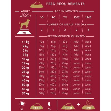 Au dos du sac, vous verrez un tableau des aliments avec, à gauche, le poids que votre chiot aura à l’âge adulte (par exemple, un chiot boxer pèse environ 25 kg à l’âge adulte). Regardez ensuite l’âge actuel de votre chiot. Dans la ligne ci-dessous, vous pouvez voir combien de repas votre chiot peut manger par jour. Jusqu’à l’âge de 6 mois, répartissez la quantité sur 3 repas. Plus tard, vous pourrez passer à 2 repas. La quantité recommandée vous permet de savoir combien de grammes votre chiot est autorisé à manger chaque jour. Divisez cette quantité par le nombre de repas que votre chiot est autorisé à prendre.