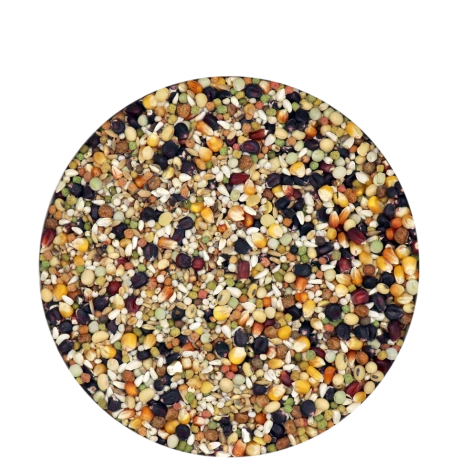 Maïs noir 10%, Maïs bordeaux 4%, Maïs rouge 4%, Maïs cribs premium 4%, Petits maïs cribs 4%, Graines de soja toasté 6%, Maple peas 4%, Petits pois verts 4%, Vesces 2%, Katjang Idjoe 2%, Froment blanc 6%, Dari blanc 12%, Dari rouge 4%, Cardy 12%, Riz Paddy 2%, Brisures de riz 2%, Avoine pelée 2%, Chanvre 3%, Sarrasin 1%, Alpiste 1%, Millet jaune 1%, Graines de lin brun 1%, Graines de navette 1%, Graines de colza noir 1%, Graines de chardon-Marie 1%, Granulé sport I.C.+ 6%